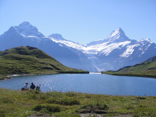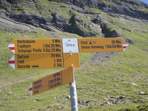 纜車站到展望台需時三十分鐘。這天陽光正好,我們三人坐在包廂式的纜車內,俯瞰腳下Grindelwald的田園風光:草地、牛群和散落有致的屋舍;遠眺壯闊山景:施雷克峰、艾格諸峰的冰河在藍天的襯托下閃動。這恬靜優美的景致綿延不絕,直到我們抵達健行起點的first展望台,草地屋舍漸少,而藍天、大山和冰河繼續,陪伴我們一整個建行來回路線。
