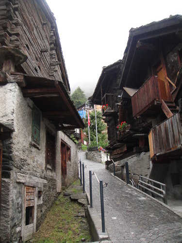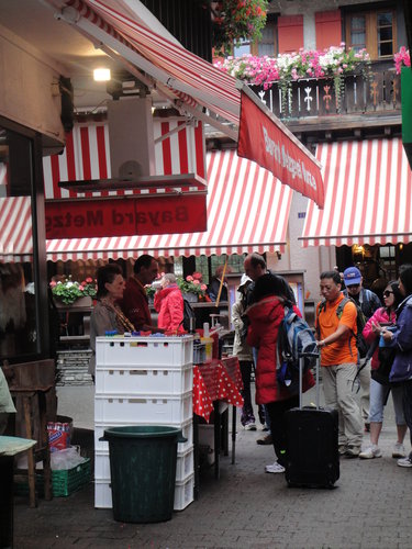 這樣惡劣的天氣,什麼也看不到,什麼也沒法做。等雨稍歇,我們在主街上繞行一圈,吃了當地的排隊名「店」:路邊攤烤香腸,拍了幾張特色建築避鼠屋之後,算是到此一遊。這攤烤香腸便宜又好吃,在連夏天都寒冷的策馬特,吃來特別溫暖,不過他和西門町的阿宗麵線一樣,是站著吃的,站著無妨,你會發現在路邊小巷和來自世界各地的人站著啃現烤德國香腸,美味加倍,實在很有趣。