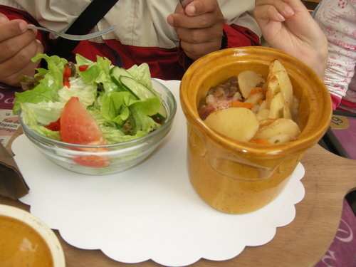 餐點上桌,我們點的是亞爾薩斯燉菜和沙拉,外加當地特色白啤酒。冒著熱煙的燉菜,看著已經讓我們超感動,豬腳加蔬菜的豐富內容和葡萄酒香氣的調味,這廚藝令人拜倒,加點的沙拉也不含糊,大把煎香的碎培根灑在青翠的生菜上,多豪氣的鄉土料理作法。更痛快的是,飽餐一頓的代價大約只和在台北市相當,真是高貴不貴啊,這餐吃得我們心滿意足。