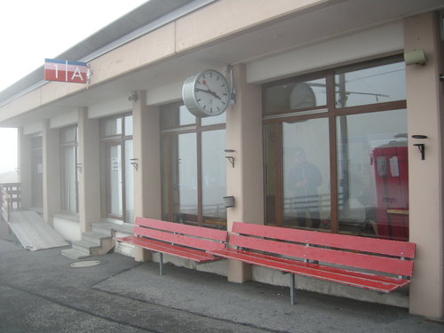 不過我們運氣不好,一下車霧就湧上來了,而且天氣越來越冷,直覺該下山的我們和幾個亞洲人躲在候車室等下山的火車,並沒想過方才和我們一起上山的阿多仔都到哪裡去了?就帶著霧濛濛的印象下山了。(下山的火車會在十分鐘內原車下山,如果上山發現狀況不對應該立即再上車,才不會徒然浪費候車的時間)