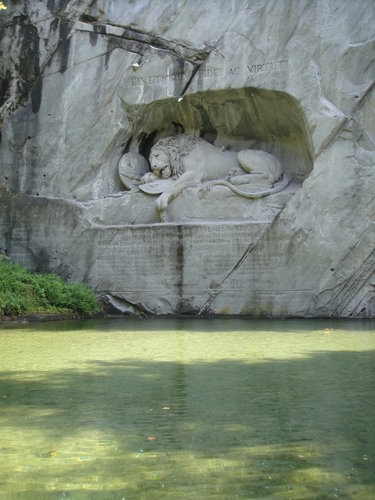 琉森的地標:垂死的獅子。被射穿心臟的獅子倒臥在盾牌與斷劍旁,即使不和瑞士的傭兵歷史做連結,仍然能輕易感受整個作品的悲傷氣氛。貼著郝夫教堂前的馬路往斜坡上走就能來到這裡,離開這個景點再繼續向前就是冰河公園。琉森的景點很集中,靠兩條腿就能走遍。