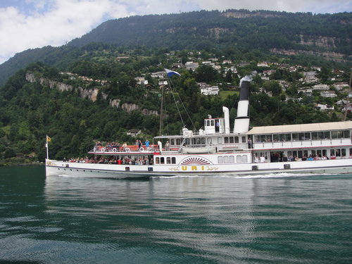 在瑞士搭車乘船都無上車(船)驗票剪票這回事,車(船)來了,上去找位子坐下便是,而且無論候車(船)的人有多少,上得車(船)去,總沒看過有人站著。我們在琉森湖的航行搭的是這種大型的渡輪,最頂上是會冒煙的煙囪,讓人有置身《湯姆歷險記》場景的錯覺。使用SWISS PASS只能坐在渡輪的下層經濟艙不能上到船頂的座位。不過我ㄧ點都不羨慕,--------瞧那船頂上太陽多大呀!小心皮膚曬黑了!