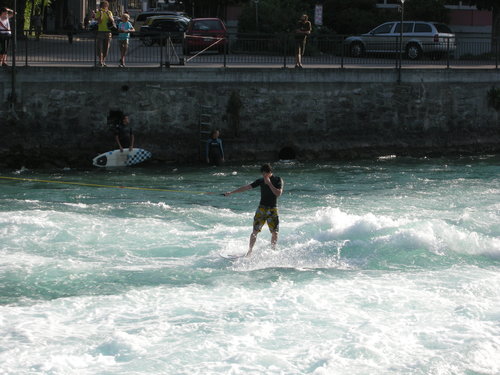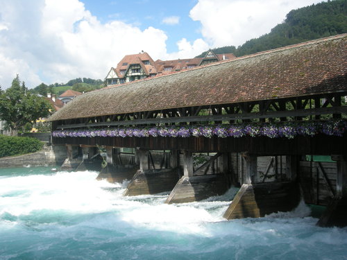 流經伯恩的阿勒河也流經圖恩,河水清澈,水量豐沛,河上1號水閘門造型和琉森的卡貝爾橋相似,我們經過時還見到有幾個年輕人在閘門口衝浪,「在河裡衝浪?有沒有搞錯呀!」可是看他們不停自我挑戰,玩得起勁兒,讓在一旁的我們也看得滋滋有味。瑞士人享有的優質生活環境,善用地形地物的創意和充滿活力的生活態度,再一次讓我留下深刻印象。