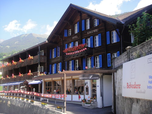 於是,我們在少女峰區的住宿便選擇由旅行社代訂的JUNGFRAU LODGE旅館。JUNGFRAU LODGE位在Grindelwald車站後方步行約八分鐘的地方,是棟傳統的瑞士木造建築,三人房每晚房價台幣六千元,在這熱門區域,價格已經是便宜的了。這旅館的早餐簡單,房間普普,連泡麵的熱水都需額外付費,唯一的優點是它面對著整個格林德瓦村,以及村莊背景艾格峰、僧侶峰與少女峰,地點絕佳。清晨黃昏從大廳走出來,優美宏偉的山景矗立在眼前,讓人心情大好,一整天的精神元氣都加足了,實現了我想住在山裡面的願望。