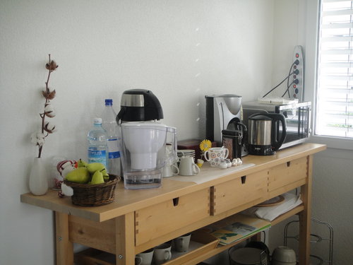 五星級加「有省錢」的豐富早餐是陳姊家一大特色。每天必定有香熱的歐式硬麵包與可頌兩種麵包,四款不同口味的火腿、乳酪,熱呼呼裝在蛋杯裡蓋著可愛杯罩的水煮蛋,果醬、奶油、優格、牛奶、果汁,現煮咖啡和多種口味的茶包。住宿陳姊家的九天,我們天天在烤麵包與熱咖啡的香味中醒來,就著窗外的晨光與Herbert為我們準備的電台古典音樂享用。趕早出門的時候提前告知主人,他會幫忙把早餐用心打包,附上餐具讓我們在火車上享用;我們每餐都吃不下的優格存放在冰箱裡的專屬格位,晚上回家就成了烤雞沙拉餐的飯後甜點。