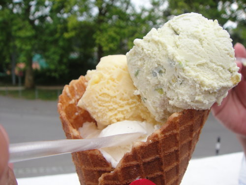瑞士本土品牌的冰淇淋,台灣也有進口。在超市眾多品牌中,屬於中上價位。帶著綠色果仁的是開心果口味。